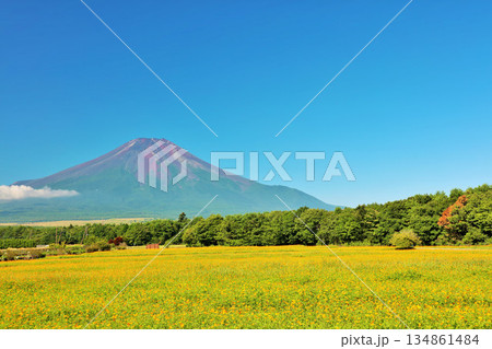 夏日的藍天,盛開的黃色波斯菊,還有富士山。