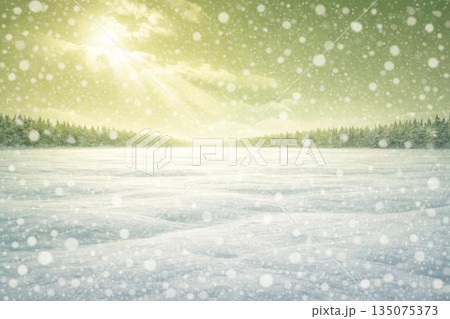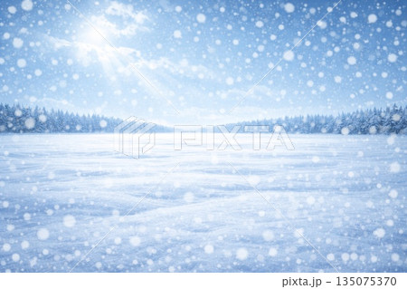 一幅寧靜清新的冬季背景插畫,雪花飄落在銀色的雪地上,天空湛藍如洗。