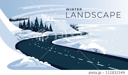 Empty country scene among hills with snowy road and fir-trees. Winter road or flat vector illustration.