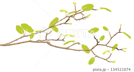 Tree branch with green leaves in spring season isolated on white background graphic illustration.