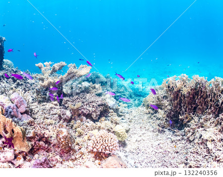 慶良間群島最大的濱珊瑚群落。美麗的珊瑚礁和成群的熱帶魚。沖繩縣島尻郡慶良間群島座間味村