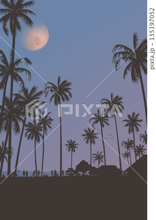Silhouetted coconut palm trees at the beach with half moon and twilight sky vertical background fade condition graphic illustration.