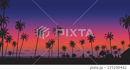 Silhouetted coconut palm trees at the beach with dramatic sky rectangle background vector illustration. Summer traveling and party at the beach concept flat design with blank space.