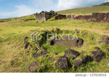 阿胡維納普1號遺址。石砌廢墟,摩艾石像僅露出頭部,復活節島