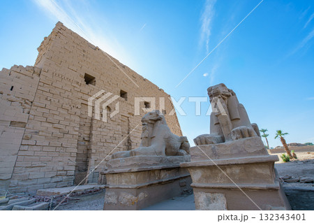Ram sphinxes and the First Pylon at Karnak Temple Complex Luxor Egypt.