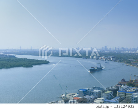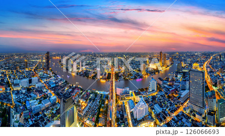 Chao Phraya River under sunset sky, twilight, view from top of Bangkok building.