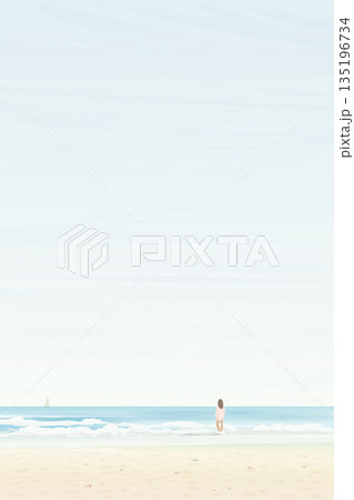 Minimalist seascape with light blue sky vertical background have a woman standing on the sandy beach and hit by waves graphic illustration.