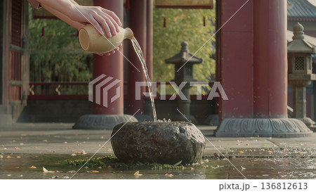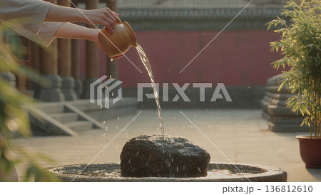Pouring Water Ritual over Stone Basin in Asian Temple, Spiritual Cleansing Ceremony