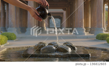 Hand Pouring Water over Zen Stone Fountain in Temple Courtyard, Serenity Concept