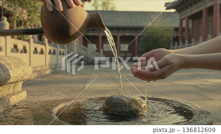 Pouring Water for Hand Cleansing Ritual at Buddhist Temple, Spiritual Purification Ceremony