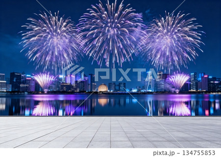 Colorful fireworks exploding over cityscape at night, illuminating skyline with vibrant colors and creating festive atmosphere