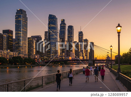 business people walking along the waterfront