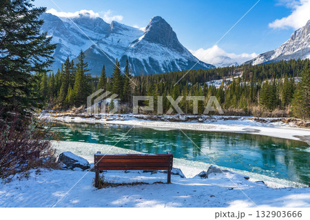 冬季的弓河和倫德爾山。加拿大艾伯塔省坎莫爾