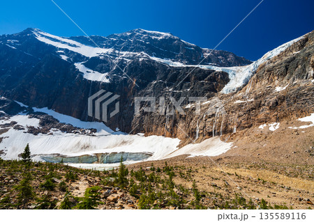 加拿大艾伯塔省伊迪絲·卡維爾山懸崖上的天使冰川和融水池
