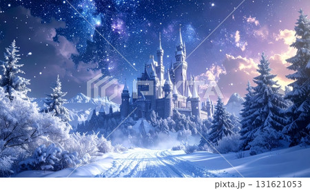 Illustration of a fantasy winter landscape with a medieval castle isolated on white background.