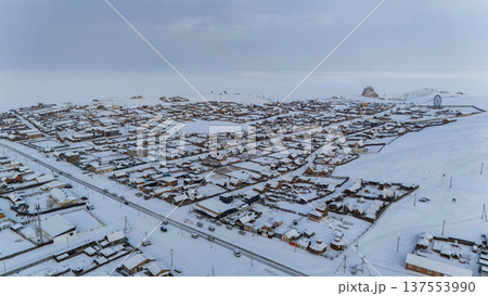 Aerial view of Khuzhir village the largest village on Olkhon island, Russia during winter season.