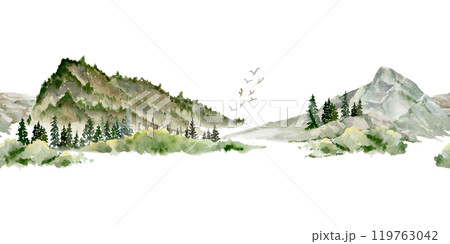 Scenery landscape coniferous forest fir spruce trees, mountains fields hills pasture land alpine vista, hand drawn in watercolor. Seamless banner. Tourism, resort ads, hiking camping sites, vacation.