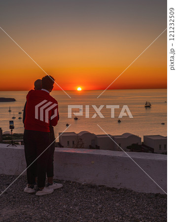 一對情侶在希臘聖托里尼欣賞浪漫的日落
