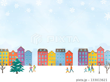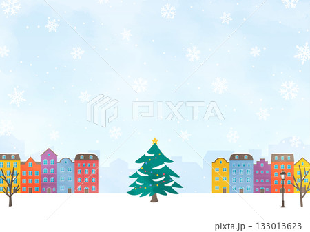 聖誕風景插畫,描繪了冬季雪景小鎮的景象