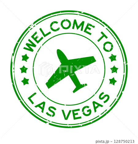 Grunge green welcome to las vegas with airplane icon round rubber seal stamp on white background