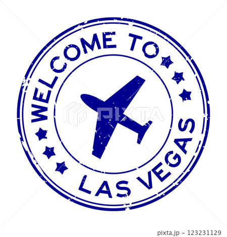 Grunge blue welcome to las vegas with airplane icon round rubber seal stamp on white background