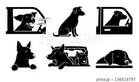 Black Solid Dog Car Ride Silhouettes Set of Six on White Background