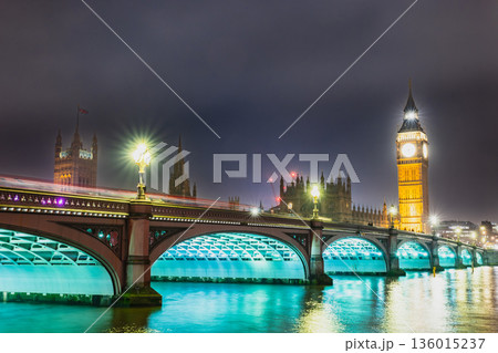 倫敦:夜幕下的伊麗莎白塔和雙層巴士