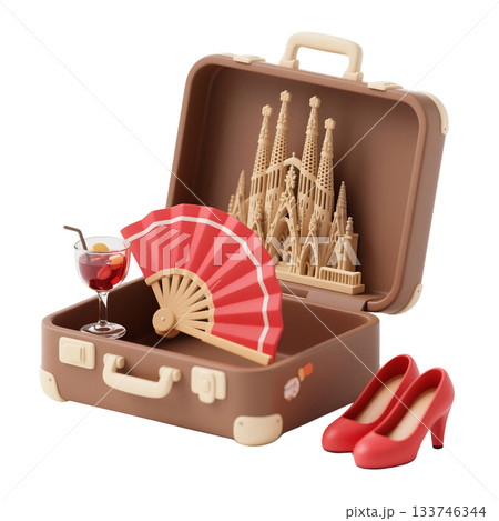 3D icon of Barcelona suitcase with Sagrada Familia, red fan, sangria cocktail, red heels, Spanish flair, isolated