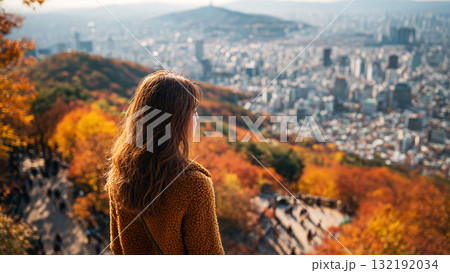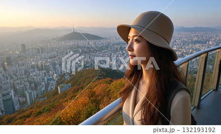 Young Woman Enjoying Scenic Sunset View of Seoul City from Elevated Observation Deck