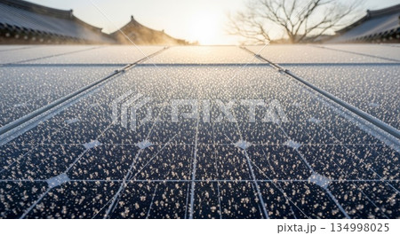 Traditional Korean palace courtyard covered in fresh snow with geometric stone patterns and classic hanok architecture at golden hour sunrise