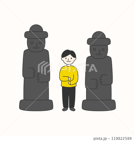A man posing among traditional stone statues on Jeju Island, Korea.