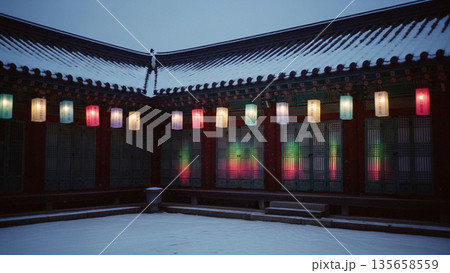 Snowy Winter Evening in a Traditional Korean Hanok Courtyard with Colorful Lanterns and Copy Space