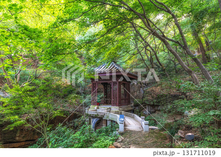 Changdeokgung Palace stonewall autumn maple forest in Seoul, Korea