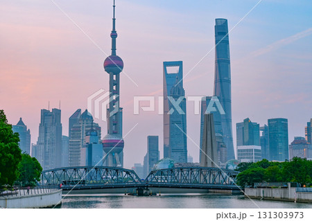 上海清晨:從蘇州河眺望東方明珠和陸家嘴摩天大樓