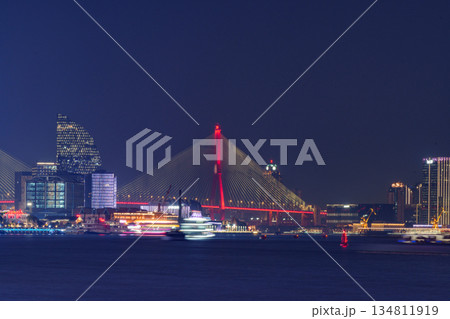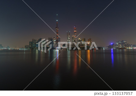 Cityscape view of Shanghai city at night. Skyscraper of Lujiazui in Pudong, view from The Bund of Shanghai, China. landmark and popular for tourism attractions. Travel and Vacation concept