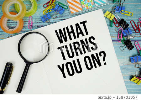 What Turns You On? text on a paper surrounded by office supplies and magnifying glass on a blue wooden surface