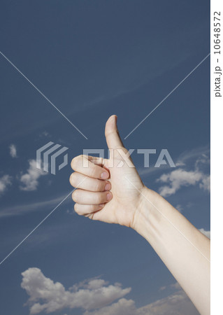 Woman's hand showing thumbs-up gesture against sky