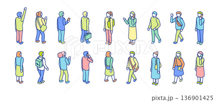 等距視角人物插畫集。行走、問候、呼喊、停下、線條繪製的人物。