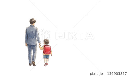 一位父親牽著一個孩子(小女孩)的手,線條畫