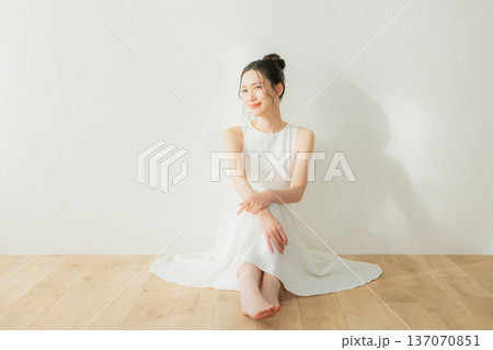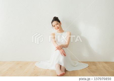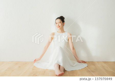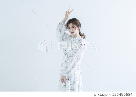 一位身穿洋裝的年輕女子站在白色背景上
