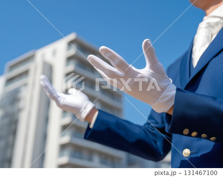 一位身穿藍色制服和白色手套的男導遊張開雙手,背景是藍天和摩天大樓