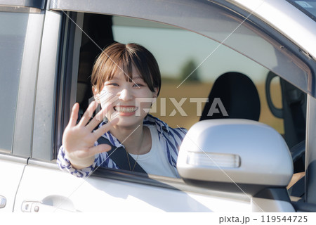 一位日本女子坐在汽車駕駛座上,望著窗外,帶著微笑。