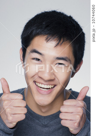 Studio portrait of young man showing thumbs up sign