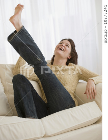 Woman kicking leg on sofa