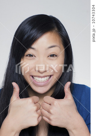 Studio portrait of young woman showing thumbs up sign