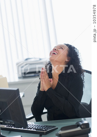 Business woman using computer and laughing