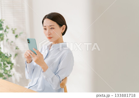 高中女生看著日式房間榻榻米上的智慧型手機,霸凌,拒絕上學,SNS 麻煩,自然色