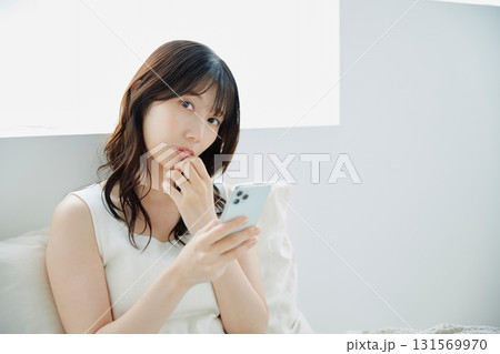 認為的婦女,當觀看智能手機時