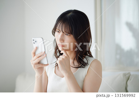坐在沙發上使用智能手機的女人