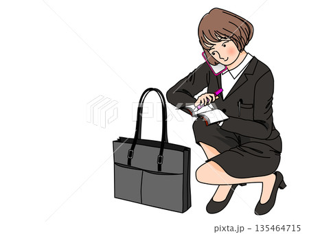 一名身穿西裝的女子蹲在街上,檢查著她的包包裡的東西。